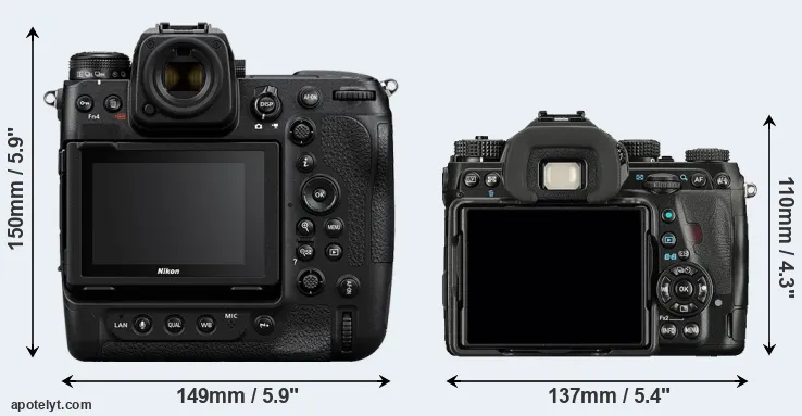 The physical size and weight of the Nikon Z9 and the Pentax K-1 are illustrated in the side-by-side display below. The two cameras are presented according to their relative size. Three successive views from the front, the top, and the rear are shown. All size dimensions are rounded to the nearest millimeter.