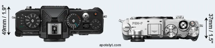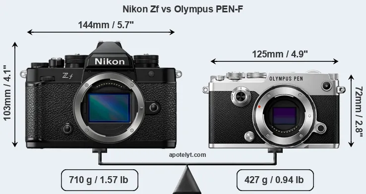 If the front view area (width x height) of the cameras is taken as an aggregate measure of their size, the Olympus PEN-F is considerably smaller (39 percent) than the Nikon Zf. Moreover, the PEN-F is substantially lighter (40 percent) than the Zf. It is worth mentioning in this context that the Zf is splash and dust resistant, while the PEN-F does not feature any corresponding weather-sealing.