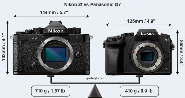If the front view area (width x height) of the cameras is taken as an aggregate measure of their size, the Panasonic G7 is notably smaller (28 percent) than the Nikon Zf. Moreover, the G7 is substantially lighter (42 percent) than the Zf. It is worth mentioning in this context that the Zf is splash and dust resistant, while the G7 does not feature any corresponding weather-sealing.
