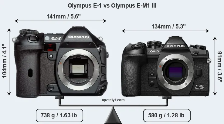 An illustration of the physical size and weight of the Olympus E-1 and the Olympus E-M1 III is provided in the side-by-side display below. The two cameras are presented according to their relative size. Three consecutive perspectives from the front, the top, and the back are available. All size dimensions are rounded to the nearest millimeter.