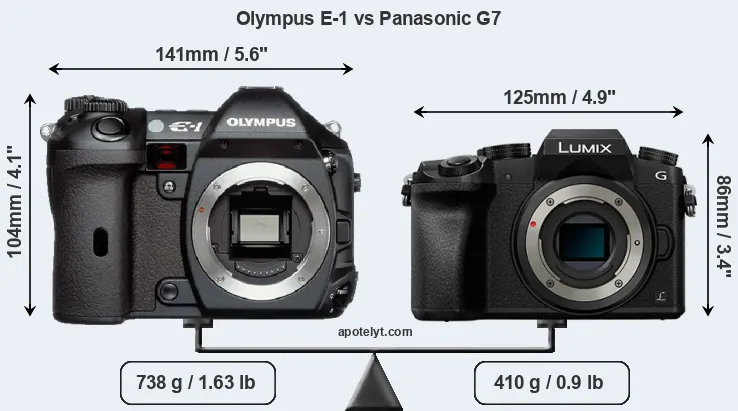 If the front view area (width x height) of the cameras is taken as an aggregate measure of their size, the Panasonic G7 is notably smaller (27 percent) than the Olympus E-1. Moreover, the G7 is substantially lighter (44 percent) than the E-1. It is worth mentioning in this context that the E-1 is splash and dust resistant, while the G7 does not feature any corresponding weather-sealing.