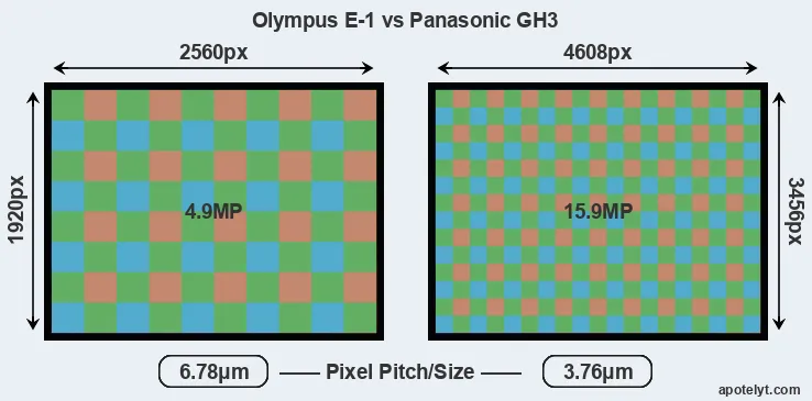 While the two cameras under review share the same sensor size, the GH3 offers a higher resolution of 15.9 megapixels, compared with 4.9 MP of the E-1. This megapixels advantage translates into a 80 percent gain in linear resolution. On the other hand, these sensor specs imply that the GH3 has a higher pixel density and a smaller size of the individual pixel (with a pixel pitch of 3.76μm versus 6.78μm for the E-1). However, it should be noted that the GH3 is much more recent (by 9 years and 2 months) than the E-1, and its sensor will have benefitted from technological advances during this time that compensate for the smaller pixel size.