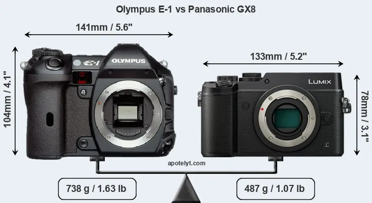 If the front view area (width x height) of the cameras is taken as an aggregate measure of their size, the Panasonic GX8 is notably smaller (29 percent) than the Olympus E-1. Moreover, the GX8 is markedly lighter (34 percent) than the E-1. In this context, it is worth noting that both cameras are splash and dust-proof and can, hence, be used in inclement weather conditions or harsh environments.