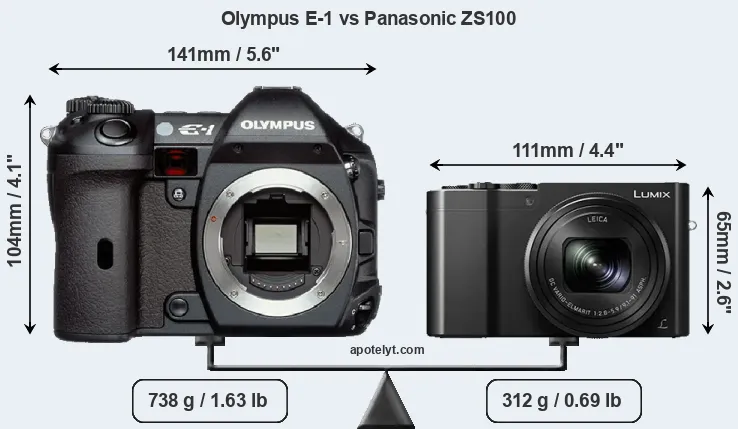 The above size and weight comparisons are to some extent incomplete and possibly misleading, as the ZS100 has a lens built in, whereas the E-1 is an interchangeable lens camera that requires a separate lens. Attaching the latter will add extra weight and bulk to the setup. You can compare the optics available for the E-1 and their specifications in the Four Thirds Lens Catalog.