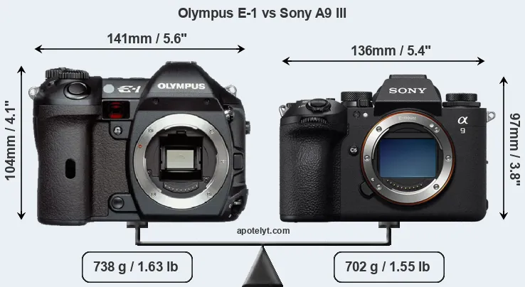 The physical size and weight of the Olympus E-1 and the Sony A9 III are illustrated in the side-by-side display below. The two cameras are presented according to their relative size. Three successive views from the front, the top, and the rear are shown. All size dimensions are rounded to the nearest millimeter.