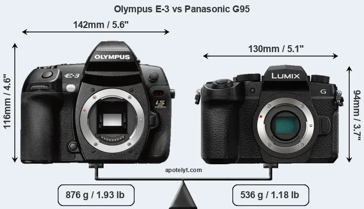 An illustration of the physical size and weight of the Olympus E-3 and the Panasonic G95 is provided in the side-by-side display below. The two cameras are presented according to their relative size. Three successive views from the front, the top, and the rear are shown. All size dimensions are rounded to the nearest millimeter.