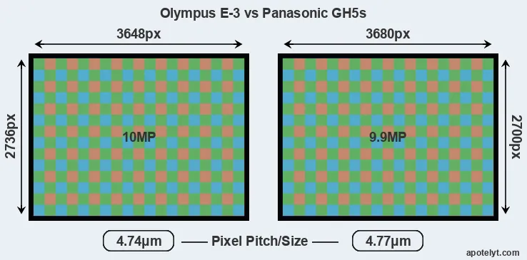 While the two cameras under review share the same sensor size, the E-3 offers a slightly higher resolution of 10 megapixels, compared with 9.9 MP of the GH5s. This megapixels advantage translates into a 0.90000000000001 percent gain in linear resolution. On the other hand, these sensor specs imply that the E-3 has a higher pixel density and a smaller size of the individual pixel (with a pixel pitch of 4.74μm versus 4.77μm for the GH5s). Moreover, it should be noted that the GH5s is much more recent (by 10 years and 2 months) than the E-3, and its sensor will have benefitted from technological advances during this time that further enhance the light gathering capacity of individual pixels. Coming back to sensor resolution, it should be mentioned that the GH5s has no anti-alias filter installed, so that it can capture all the detail its sensor resolves.