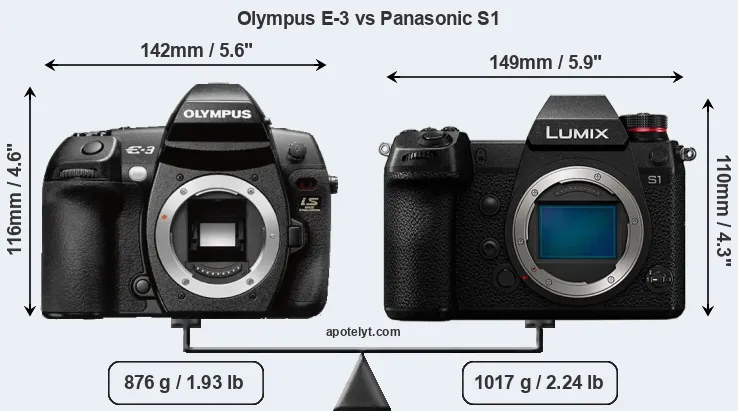 The physical size and weight of the Olympus E-3 and the Panasonic S1 are illustrated in the side-by-side display below. The two cameras are presented according to their relative size. Three consecutive views from the front, the top, and the rear side are shown. All size dimensions are rounded to the nearest millimeter.