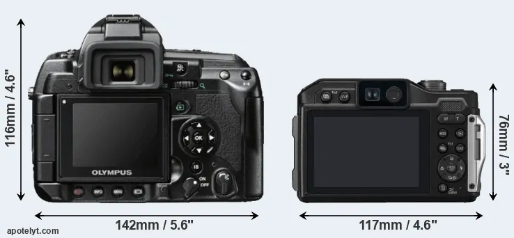 The above size and weight comparisons are to some extent incomplete and possibly misleading, as the TS7 has a lens built in, whereas the E-3 is an interchangeable lens camera that requires a separate lens. Attaching the latter will add extra weight and bulk to the setup. You can compare the optics available for the E-3 and their specifications in the Four Thirds Lens Catalog.
