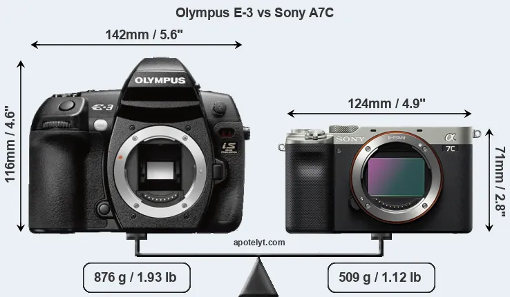 The physical size and weight of the Olympus E-3 and the Sony A7C are illustrated in the side-by-side display below. The two cameras are presented according to their relative size. Three consecutive views from the front, the top, and the rear side are shown. All width, height and depth dimensions are rounded to the nearest millimeter.