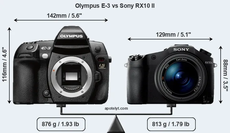 The above size and weight comparisons are to some extent incomplete and possibly misleading, as the RX10 II has a lens built in, whereas the E-3 is an interchangeable lens camera that requires a separate lens. Attaching the latter will add extra weight and bulk to the setup. You can compare the optics available for the E-3 and their specifications in the Four Thirds Lens Catalog.