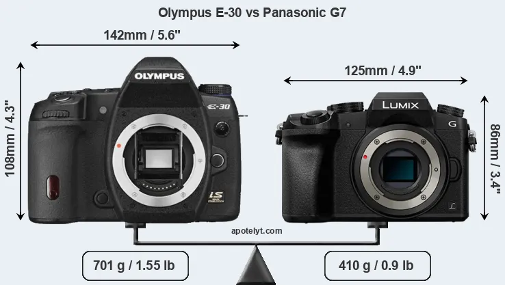 If the front view area (width x height) of the cameras is taken as an aggregate measure of their size, the Panasonic G7 is considerably smaller (30 percent) than the Olympus E-30. Moreover, the G7 is substantially lighter (42 percent) than the E-30. In this context, it is worth noting that neither the E-30 nor the G7 are weather-sealed.