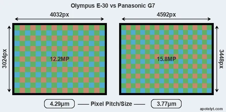 | Sensor Specs | Olympus E-30 | Panasonic G7 |