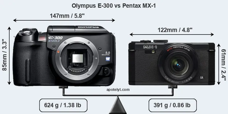 The physical size and weight of the Olympus E-300 and the Pentax MX-1 are illustrated in the side-by-side display below. The two cameras are presented according to their relative size. Three consecutive perspectives from the front, the top, and the back are available. All width, height and depth dimensions are rounded to the nearest millimeter.