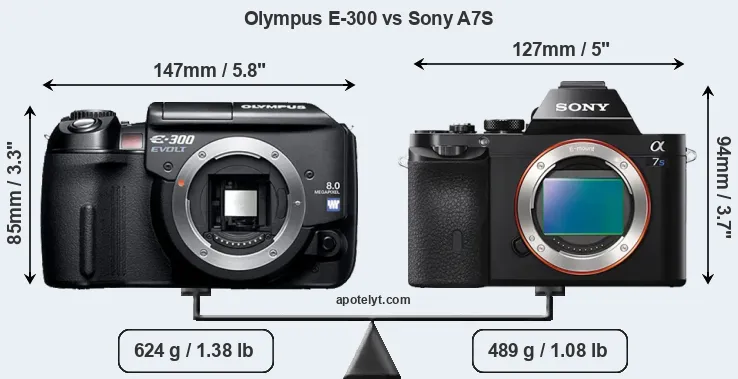 If the front view area (width x height) of the cameras is taken as an aggregate measure of their size, the Sony A7S is somewhat smaller (4 percent) than the Olympus E-300. Moreover, the A7S is markedly lighter (22 percent) than the E-300. It is noteworthy in this context that the A7S is splash and dust-proof, while the E-300 does not feature any corresponding weather-sealing.