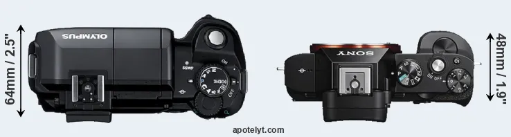 An illustration of the physical size and weight of the Olympus E-300 and the Sony A7S is provided in the side-by-side display below. The two cameras are presented according to their relative size. Three consecutive perspectives from the front, the top, and the back are available. All size dimensions are rounded to the nearest millimeter.