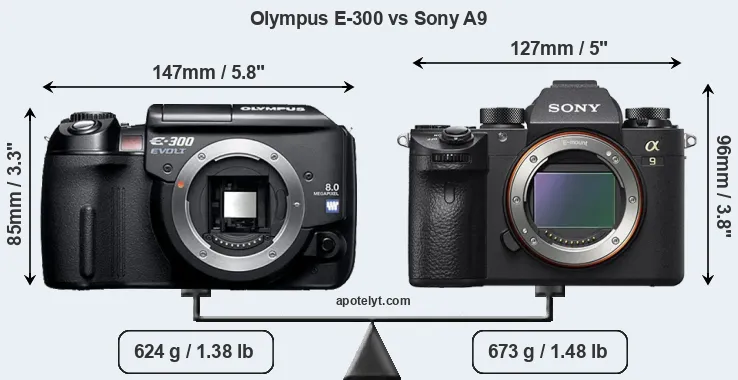If the front view area (width x height) of the cameras is taken as an aggregate measure of their size, the Sony A9 is somewhat smaller (2 percent) than the Olympus E-300. However, the A9 is markedly heavier (8 percent) than the E-300. It is noteworthy in this context that the A9 is splash and dust-proof, while the E-300 does not feature any corresponding weather-sealing.