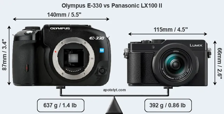 The above size and weight comparisons are to some extent incomplete and possibly misleading, as the LX100 II has a lens built in, whereas the E-330 is an interchangeable lens camera that requires a separate lens. Attaching the latter will add extra weight and bulk to the setup. You can compare the optics available for the E-330 and their specifications in the Four Thirds Lens Catalog.