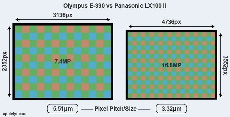 Despite having a smaller sensor, the LX100 II offers a higher resolution of 16.8 megapixels, compared with 7.4 MP of the E-330. This megapixels advantage comes at the cost of a higher pixel density and a smaller size of the individual pixel (with a pixel pitch of 3.32μm versus 5.51μm for the E-330). However, it should be noted that the LX100 II is much more recent (by 12 years and 6 months) than the E-330, and its sensor will have benefitted from technological advances during this time that make it possible to gather light more efficiently. Coming back to sensor resolution, it should be mentioned that the LX100 II has no anti-alias filter installed, so that it can capture all the detail its sensor resolves.