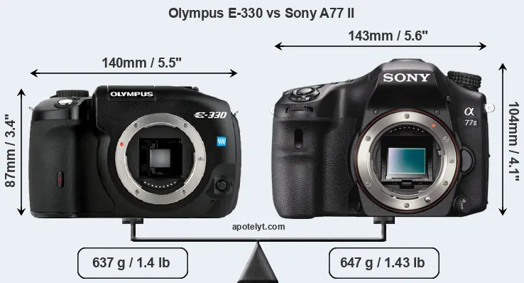 If the front view area (width x height) of the cameras is taken as an aggregate measure of their size, the Sony A77 II is notably larger (22 percent) than the Olympus E-330. Moreover, the A77 II is slightly heavier (2 percent) than the E-330. It is noteworthy in this context that the A77 II is splash and dust-proof, while the E-330 does not feature any corresponding weather-sealing.