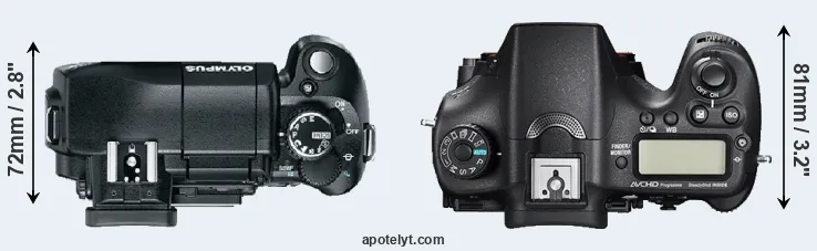 The side-by-side display below illustrates the physical size and weight of the Olympus E-330 and the Sony A77 II. The two cameras are presented according to their relative size. Three consecutive perspectives from the front, the top, and the back are available. All width, height and depth measures are rounded to the nearest millimeter.