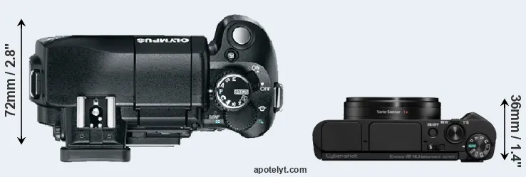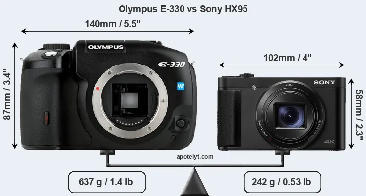 The side-by-side display below illustrates the physical size and weight of the Olympus E-330 and the Sony HX95. The two cameras are presented according to their relative size. Three consecutive perspectives from the front, the top, and the back are available. All width, height and depth measures are rounded to the nearest millimeter.