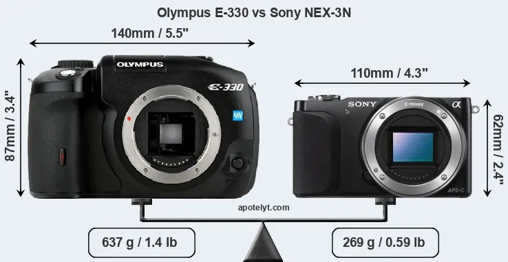 If the front view area (width x height) of the cameras is taken as an aggregate measure of their size, the Sony NEX-3N is considerably smaller (44 percent) than the Olympus E-330. Moreover, the NEX-3N is substantially lighter (58 percent) than the E-330. In this context, it is worth noting that neither the E-330 nor the NEX-3N are weather-sealed.