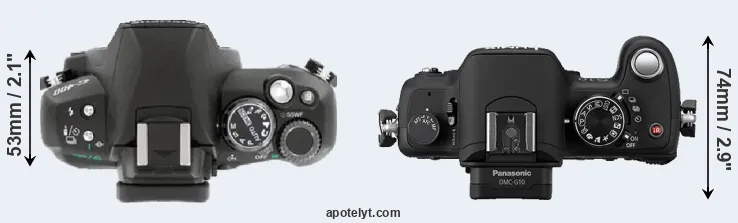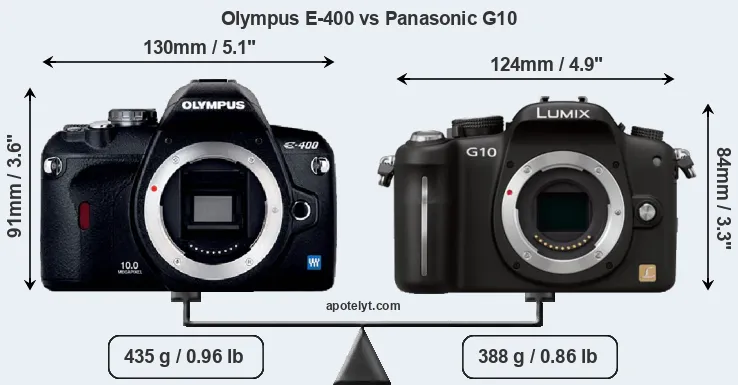 The side-by-side display below illustrates the physical size and weight of the Olympus E-400 and the Panasonic G10. The two cameras are presented according to their relative size. Three consecutive perspectives from the front, the top, and the back are available. All width, height and depth measures are rounded to the nearest millimeter.