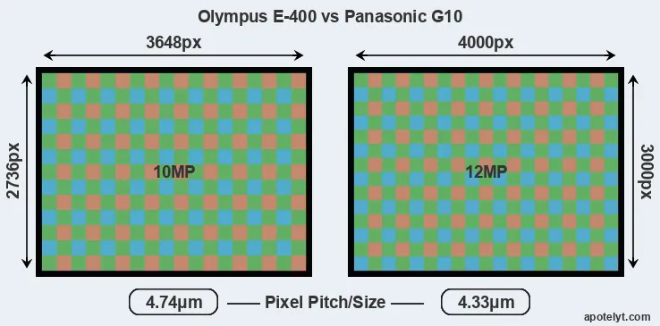 While the two cameras under review share the same sensor size, the G10 offers a higher resolution of 12 megapixels, compared with 10 MP of the E-400. This megapixels advantage translates into a 10 percent gain in linear resolution. On the other hand, these sensor specs imply that the G10 has a higher pixel density and a smaller size of the individual pixel (with a pixel pitch of 4.33μm versus 4.74μm for the E-400). However, it should be noted that the G10 is much more recent (by 3 years and 5 months) than the E-400, and its sensor will have benefitted from technological advances during this time that compensate for the smaller pixel size.
