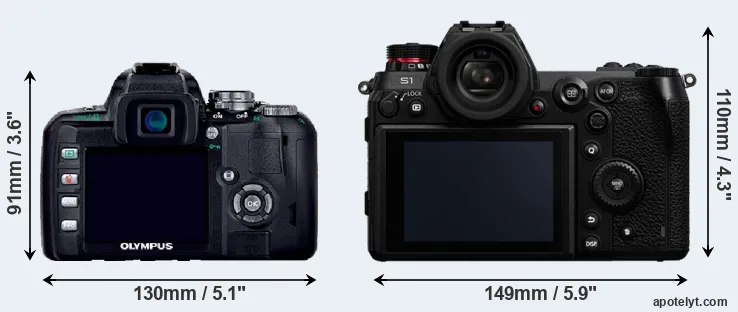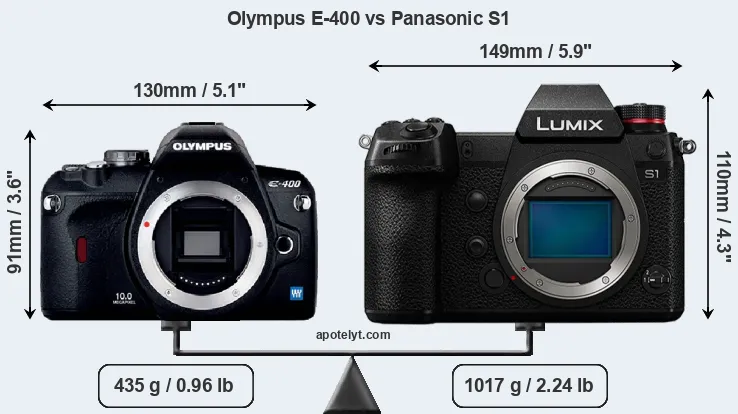 If the front view area (width x height) of the cameras is taken as an aggregate measure of their size, the Panasonic S1 is notably larger (39 percent) than the Olympus E-400. Moreover, the S1 is substantially heavier (134 percent) than the E-400. It is noteworthy in this context that the S1 is splash and dust-proof, while the E-400 does not feature any corresponding weather-sealing.