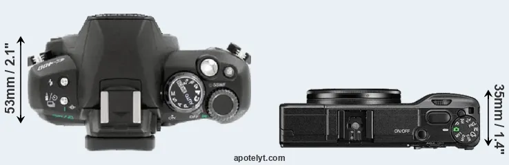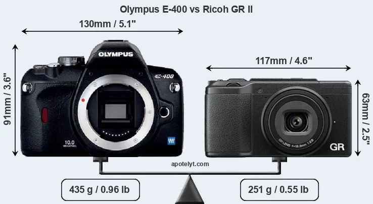 The above size and weight comparisons are to some extent incomplete and possibly misleading, as the GR II has a lens built in, whereas the E-400 is an interchangeable lens camera that requires a separate lens. Attaching the latter will add extra weight and bulk to the setup. You can compare the optics available for the E-400 and their specifications in the Four Thirds Lens Catalog.