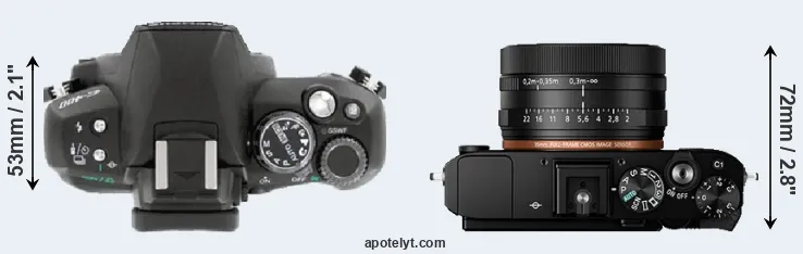The above size and weight comparisons are to some extent incomplete and possibly misleading, as the RX1R II has a lens built in, whereas the E-400 is an interchangeable lens camera that requires a separate lens. Attaching the latter will add extra weight and bulk to the setup. You can compare the optics available for the E-400 and their specifications in the Four Thirds Lens Catalog.
