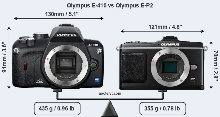 An illustration of the physical size and weight of the Olympus E-410 and the Olympus E-P2 is provided in the side-by-side display below. The two cameras are presented according to their relative size. Three successive views from the front, the top, and the rear are shown. All width, height and depth measures are rounded to the nearest millimeter.