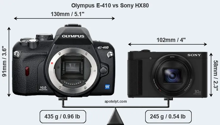 An illustration of the physical size and weight of the Olympus E-410 and the Sony HX80 is provided in the side-by-side display below. The two cameras are presented according to their relative size. Three successive views from the front, the top, and the rear are shown. All width, height and depth measures are rounded to the nearest millimeter.