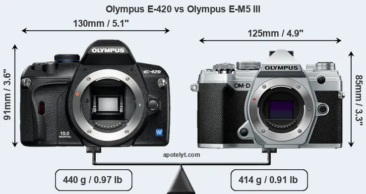 If the front view area (width x height) of the cameras is taken as an aggregate measure of their size, the Olympus E-M5 III is notably smaller (10 percent) than the Olympus E-420. Moreover, the E-M5 III is markedly lighter (6 percent) than the E-420. It is noteworthy in this context that the E-M5 III is splash and dust-proof, while the E-420 does not feature any corresponding weather-sealing.