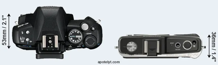 An illustration of the physical size and weight of the Olympus E-420 and the Olympus E-P2 is provided in the side-by-side display below. The two cameras are presented according to their relative size. Three successive views from the front, the top, and the rear are shown. All width, height and depth measures are rounded to the nearest millimeter.