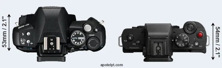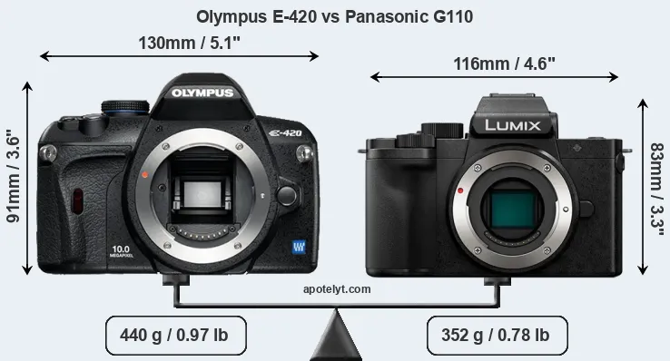 The side-by-side display below illustrates the physical size and weight of the Olympus E-420 and the Panasonic G110. The two cameras are presented according to their relative size. Three consecutive perspectives from the front, the top, and the back are available. All width, height and depth dimensions are rounded to the nearest millimeter.