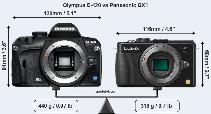 If the front view area (width x height) of the cameras is taken as an aggregate measure of their size, the Panasonic GX1 is considerably smaller (33 percent) than the Olympus E-420. Moreover, the GX1 is markedly lighter (28 percent) than the E-420. In this context, it is worth noting that neither the E-420 nor the GX1 are weather-sealed.