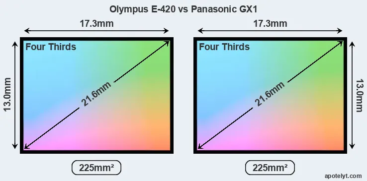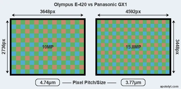 While the two cameras under review share the same sensor size, the GX1 offers a higher resolution of 15.8 megapixels, compared with 10 MP of the E-420. This megapixels advantage translates into a 26 percent gain in linear resolution. On the other hand, these sensor specs imply that the GX1 has a higher pixel density and a smaller size of the individual pixel (with a pixel pitch of 3.77μm versus 4.74μm for the E-420). However, it should be noted that the GX1 is much more recent (by 3 years and 8 months) than the E-420, and its sensor will have benefitted from technological advances during this time that compensate for the smaller pixel size.
