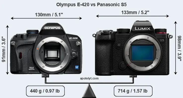 If the front view area (width x height) of the cameras is taken as an aggregate measure of their size, the Panasonic S5 is notably larger (10 percent) than the Olympus E-420. Moreover, the S5 is substantially heavier (62 percent) than the E-420. It is noteworthy in this context that the S5 is splash and dust-proof, while the E-420 does not feature any corresponding weather-sealing.