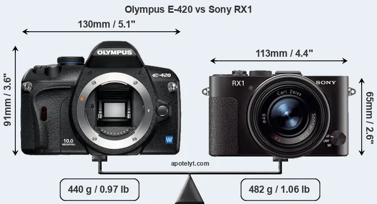 The above size and weight comparisons are to some extent incomplete and possibly misleading, as the RX1 has a lens built in, whereas the E-420 is an interchangeable lens camera that requires a separate lens. Attaching the latter will add extra weight and bulk to the setup. You can compare the optics available for the E-420 and their specifications in the Four Thirds Lens Catalog.