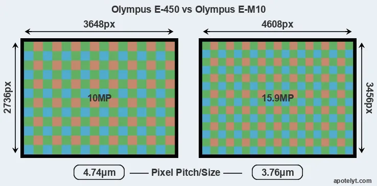 | Sensor Specs | Olympus E-450 | Olympus E-M10 |