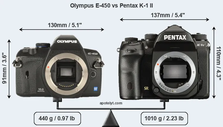If the front view area (width x height) of the cameras is taken as an aggregate measure of their size, the Pentax K-1 II is notably larger (27 percent) than the Olympus E-450. Moreover, the K-1 II is substantially heavier (130 percent) than the E-450. It is noteworthy in this context that the K-1 II is splash and dust-proof, while the E-450 does not feature any corresponding weather-sealing.