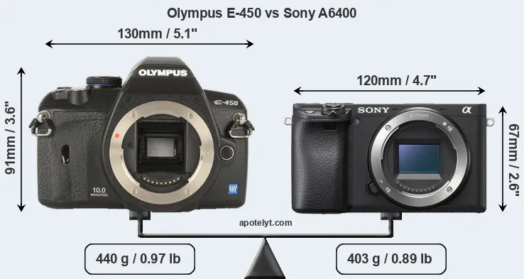 If the front view area (width x height) of the cameras is taken as an aggregate measure of their size, the Sony A6400 is considerably smaller (32 percent) than the Olympus E-450. Moreover, the A6400 is markedly lighter (8 percent) than the E-450. It is noteworthy in this context that the A6400 is splash and dust-proof, while the E-450 does not feature any corresponding weather-sealing.