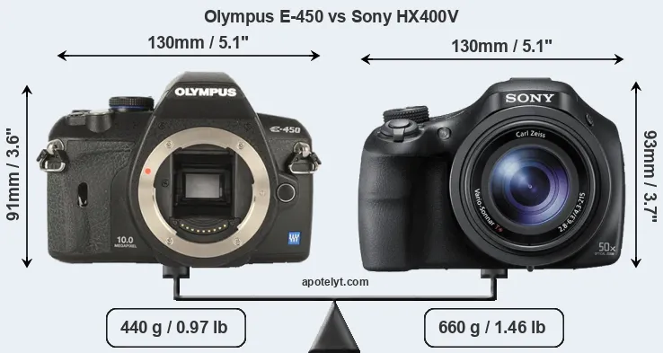 The above size and weight comparisons are to some extent incomplete and possibly misleading, as the HX400V has a lens built in, whereas the E-450 is an interchangeable lens camera that requires a separate lens. Attaching the latter will add extra weight and bulk to the setup. You can compare the optics available for the E-450 and their specifications in the Four Thirds Lens Catalog.