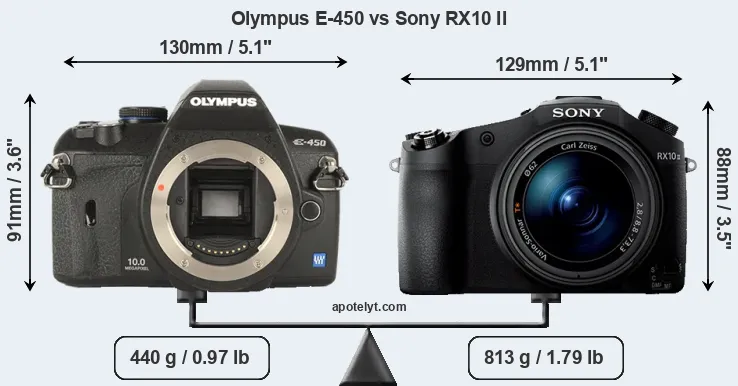 The above size and weight comparisons are to some extent incomplete and possibly misleading, as the RX10 II has a lens built in, whereas the E-450 is an interchangeable lens camera that requires a separate lens. Attaching the latter will add extra weight and bulk to the setup. You can compare the optics available for the E-450 and their specifications in the Four Thirds Lens Catalog.