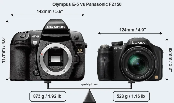 An illustration of the physical size and weight of the Olympus E-5 and the Panasonic FZ150 is provided in the side-by-side display below. The two cameras are presented according to their relative size. Three consecutive views from the front, the top, and the rear side are shown. All width, height and depth dimensions are rounded to the nearest millimeter.