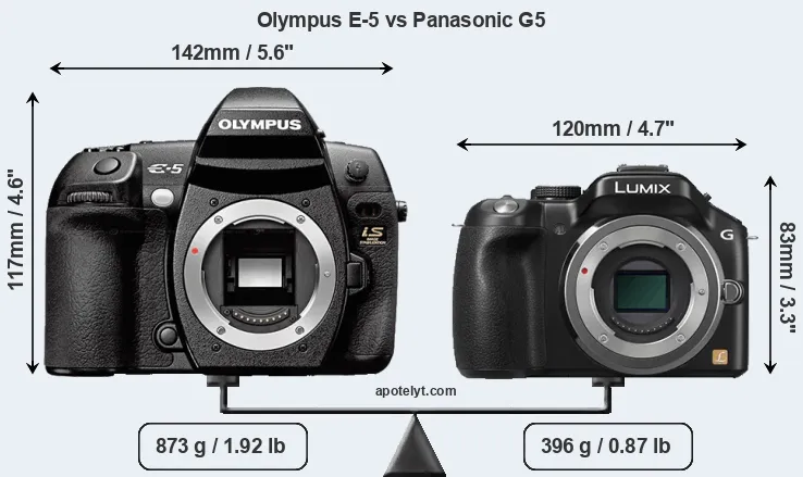 If the front view area (width x height) of the cameras is taken as an aggregate measure of their size, the Panasonic G5 is considerably smaller (40 percent) than the Olympus E-5. Moreover, the G5 is substantially lighter (55 percent) than the E-5. It is worth mentioning in this context that the E-5 is splash and dust resistant, while the G5 does not feature any corresponding weather-sealing.