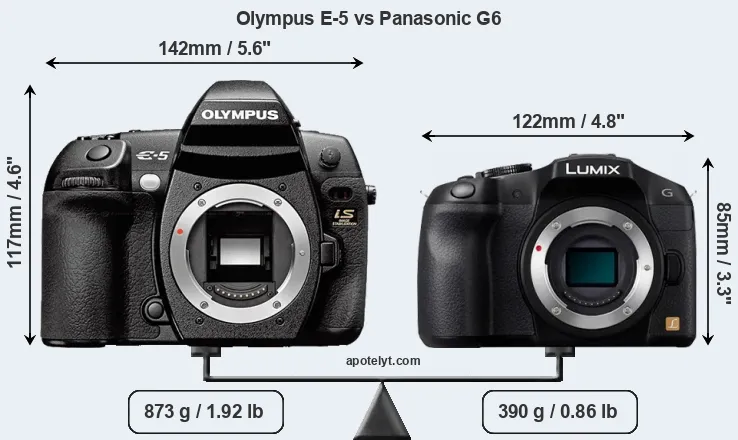 If the front view area (width x height) of the cameras is taken as an aggregate measure of their size, the Panasonic G6 is considerably smaller (38 percent) than the Olympus E-5. Moreover, the G6 is substantially lighter (55 percent) than the E-5. It is worth mentioning in this context that the E-5 is splash and dust resistant, while the G6 does not feature any corresponding weather-sealing.