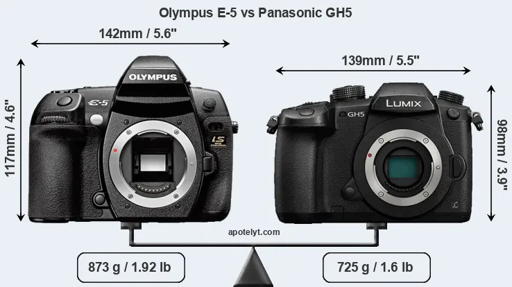 The physical size and weight of the Olympus E-5 and the Panasonic GH5 are illustrated in the side-by-side display below. The two cameras are presented according to their relative size. Three consecutive perspectives from the front, the top, and the back are available. All width, height and depth measures are rounded to the nearest millimeter.
